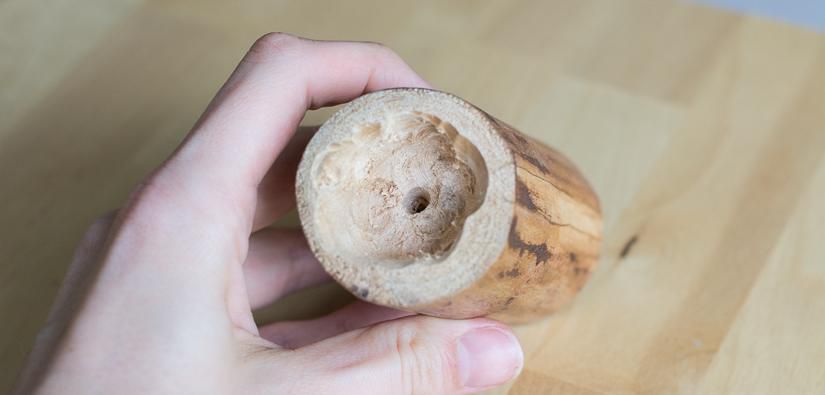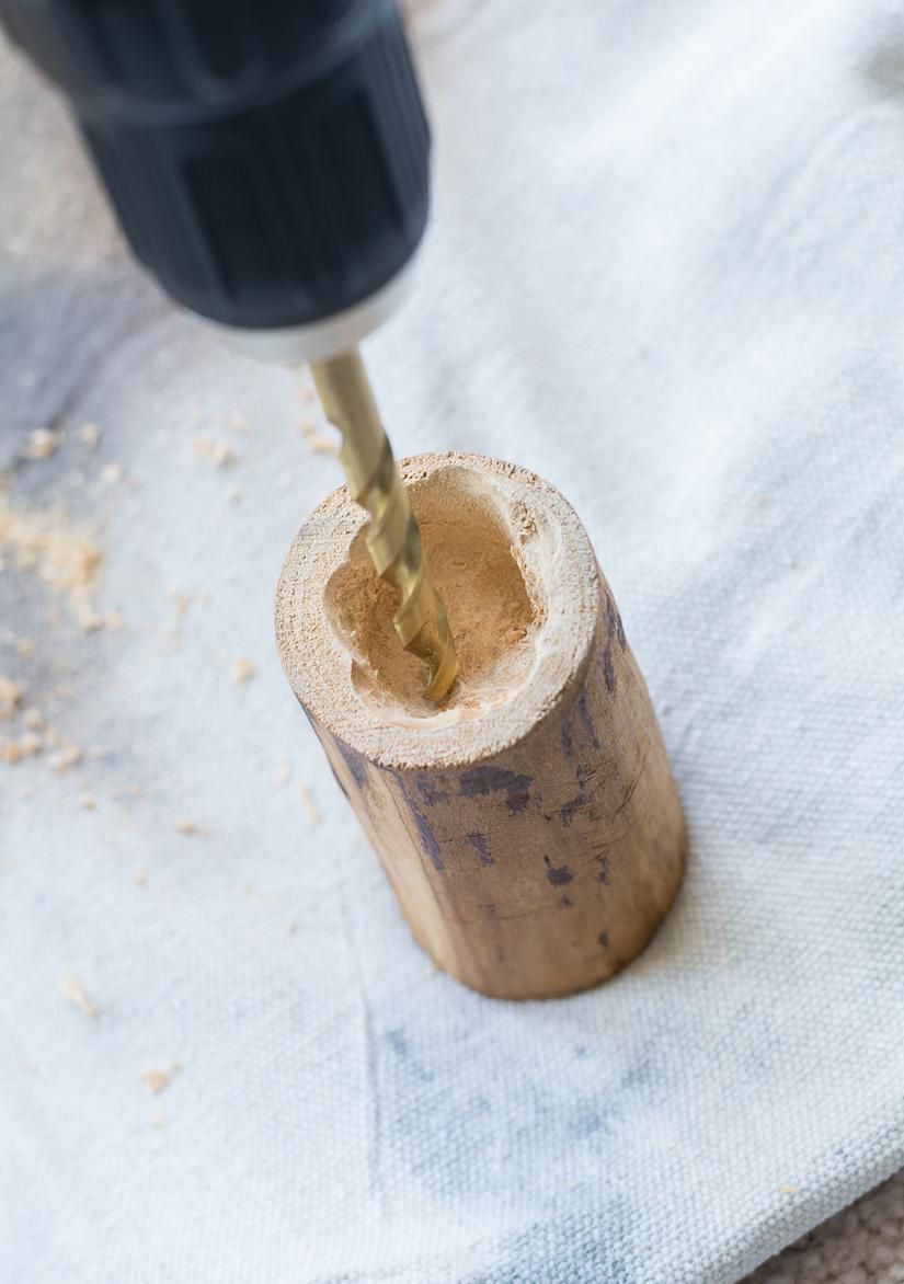 Then drill a small hole in the center of the upper offcut. Varying sizes of drill bits, drill a recess in the central part.