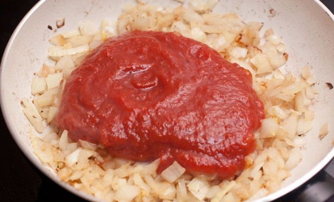 And now you can start a sauce cooking. To cook it, you will need to chop onion and fry it. To do this, you can use the saucepan, where you fried the filet. In advance, pour there one spoon of olive oil. When onion browns, add tomato puree to it and begin to stew around 7 minutes on a small fire. If your sauce seems too consistent for you, it is possible to add boiling water.