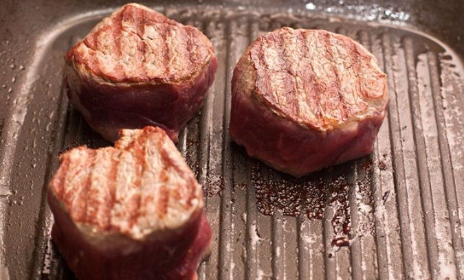 Now take a frying pan with a thick bottom and warm it up in advance on a strong fire. As soon as it starts to smoke, remove it from fire and let it cool down a bit. Then put slices of filet on the frying pan so that there would be sufficiently large distance between them. Cover with salt and pepper, fry each slice around two minutes on each side. If you use a grill pan, turning over a slice of fillet, put it to the side in order to form a typical grid pattern. After the completion of the cooking, put your filet minion into the oven for about ten minutes and turn it on for the temperature of 50 degrees. Do not forget to cover the dish from the top in foil. It is required to intensely warm up the meat inside and to spread the meat juice evenly inside it.