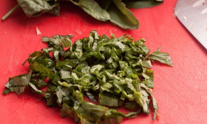 Wash basil leaves in cold water and chop them maximally finely.