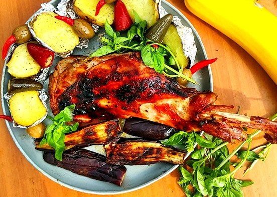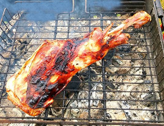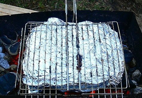 4. By the way, there, in the foil to the leg you can put a variety of vegetables. They will excellently roast on the coals with the meat. And they will have a matchless taste! Put it all on the grill and secure over the barbecue. It must roast half an hour on either side. The coals should be hot.