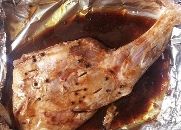 3. We take the foil. Put a lamb leg on it: I’m going to marinate it right in the foil. In it I will bake it. I pour a glass of red semi-sweet wine. Rub the spices on the leg. Carefully wrap it in the foil, so much so that the marinade should not leak, but remained inside. And that’s it, you can take it to a picnic.