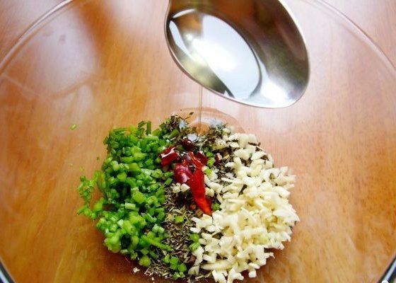 2. We prepare the spices. Cut finely garlic, onion and greens. Add spices, salt and pepper. Pour a spoonful of olive oil, although it is not necessarily.