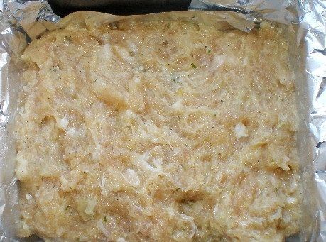 Step 3. Mix the flavored minced meat with hands, then put it into a rectangular pan (preferably)and cover with foil. Form a kind of brick and loosely cover the future bread with foil.