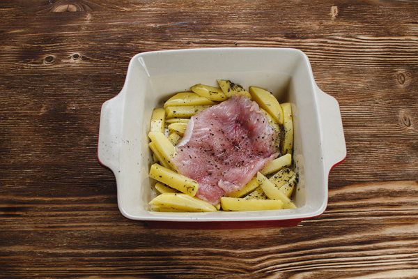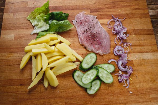 1. First of all, remember to heat the oven to 180 С for 5 minutes. Cut the turkey fillet in half lengthwise and then each half – for two pieces. в течении 5 минут. Slice the potato in long stick as for French fry. Onions are sliced in half-rings, the cucumber – in rings and Romano is just randomly cut.