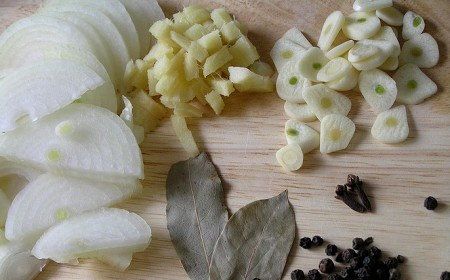 Slice onion into semi- circles, split garlic into cloves, cut ginger into roughly the same pieces. Press slightly the peppercorns. Prepare bay leaves and cloves.