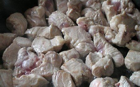 Slice the pork into loin chops (3x3 cm), fry them on the seed oil to get a golden brown, add all the rest of the ingredients,