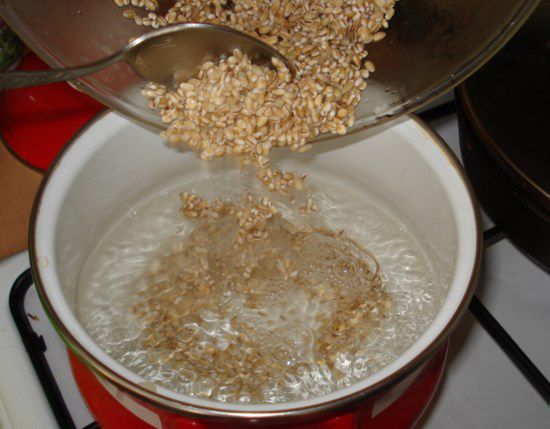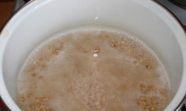 Pour 2 cups of water in the saucepan. When the water starts boiling put in the salt. Put in the prepared groats and cover it with the top. Cook the barley on slow fire until it becomes thick (about 25 minutes).