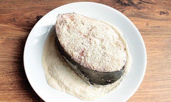 Pour rusks into an appropriate bowl. Roll each stake in breading properly and then put your fish on the heated frying pan with vegetable oil.