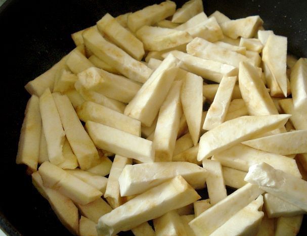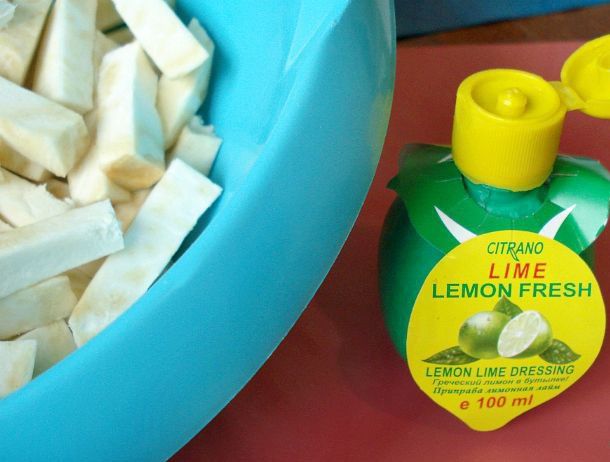 2. Cut it the way you usually cut potatoes. I cut it into strips. Put the pieces into some container and spray it with lemon juice (I used concentrated lime juice). Leave it for 7-10 minutes.