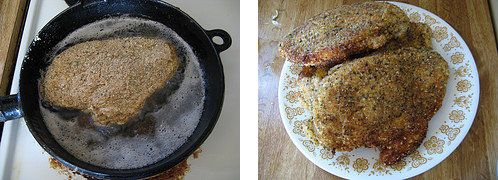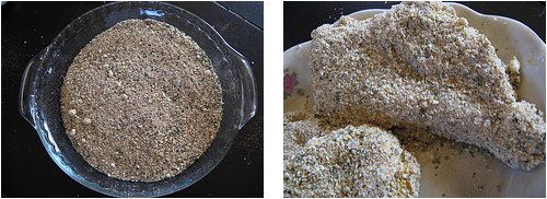Step 1: Put chicken fillets in between the sheets of waxed paper and tenderize it with the help of a steak hammer so that the thickness of the fillets is equal everywhere (it should approximately be 1 cm). You mix breadcrumbs, marjoram, basil, cayenne pepper and parmesan in one bowl. You need to break an egg and whip it up a bit in another bowl. Pour flour in a separate bowl. Crumb the fillets first in flour, then, in egg and, after that, in the mixture made out of breadcrumbs, cheese and species.