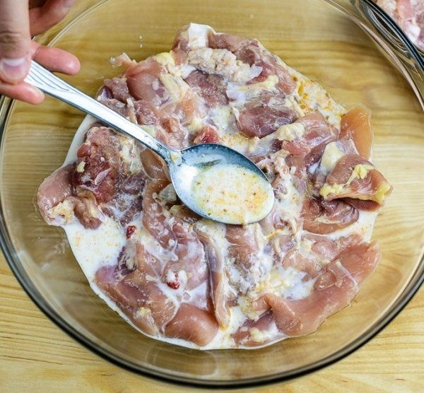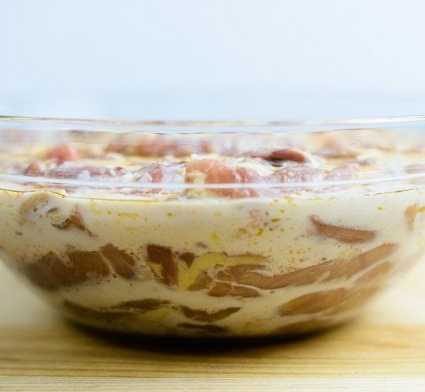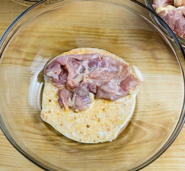 4. Go on adding more marinade and thighs in the bowl in turns. You do it till you run out of thighs. The rest of the marinade we pour on top of the thighs. You may simply put the thighs into the bowl, pour marinade in it and mix everything. However, judging by our experience, we may say that this way the thighs may not marinade well. In order for the marinade to mix with the thighs in a better way you ned to add marinade and thighs in turns.