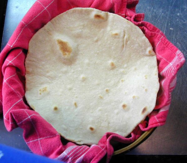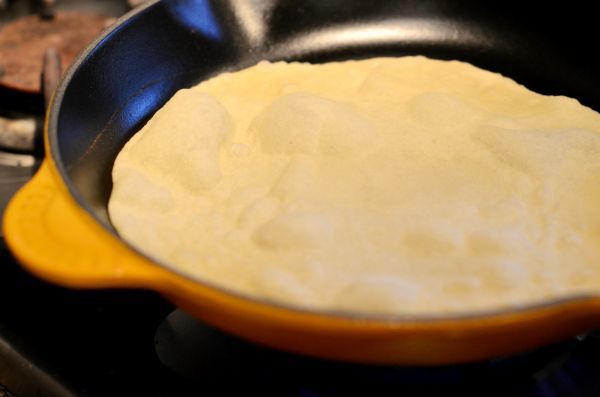 1. Mix flour with salt, baking powder and canola oil and add hot water.