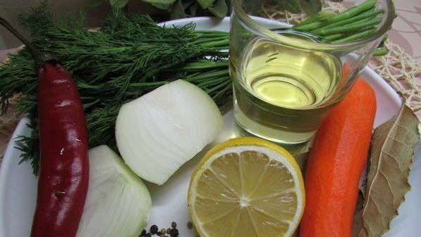 Fill a pan with water, put there carrots, dill, onion, chopped into several pieces, spicy red pepper, black pepper peas, coriander, bay leaf, lemon, oil, salt and bring to a boil.