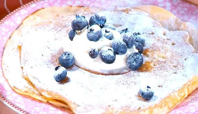 Put some sour cream and berries on your prepared crepes and strew them with icing sugar.