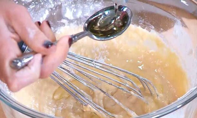 Pour in 3 tablespoonfuls of olive oil and vanilla extract in your dough, and mix this mass.