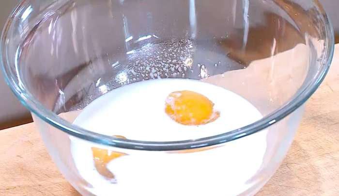 Add eggs, sugar and salt to milk and mix this mass using the egg whisk.