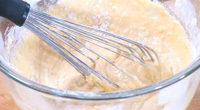 Pour flour and soda into eggs and milk mix and make dough so that there are no clumps and nubbins in it.