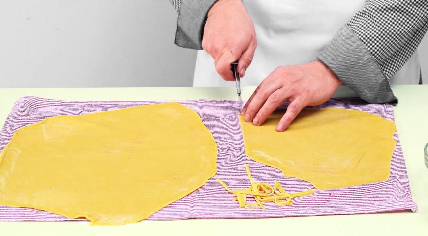 Step 6. Leave the layers on the towel. When the ends start to change their color and texture, cut the noodles with the scissors or with a pizza knife.