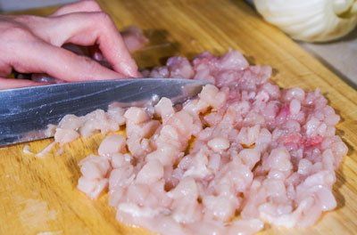 We need to slit chicken breast. We get several layers. Then, we need to chop up each layer with the help of a knife. Add salt and ground pepper to the chicken mincemeat.