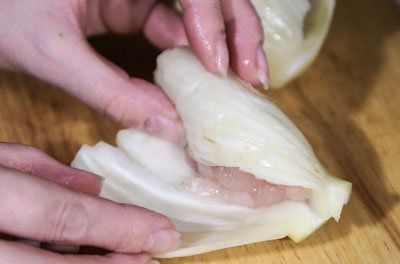 We put 1 teaspoon of chicken mincemeat on each plate of fennel. Then we wrap it in a roll.