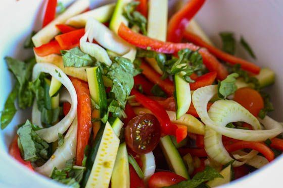 We should prepare vegetables. We slice marrow or zucchini, sweet pepper and carrots. We cut garlic into small plates; we tear basil leaves with hands. We cut cherry tomatoes in half. Put all vegetables in a deep bowl, we pour on vegetables juice of half of a lemon, vegetable oil, we add salt and pepper. Mix everything up.