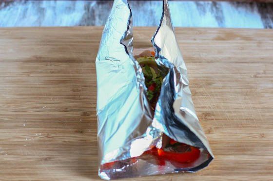 Roll the side edges of the envelope up – so that fish and vegetables juice cannot came out during cooking. We put fish with vegetables in a foil to the oven warmed to 200 degrees for 30 minutes.