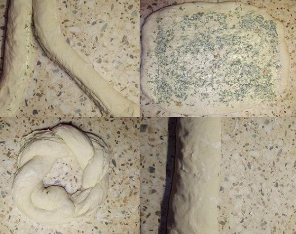 Step 5. When the dough has risen, roll it into a rectangle. Coat it with the filling and make a swirl. Now you are to cut the swirl lengthwise. Do not cut one end completely. Shape the dough to make a wreath. Join the ends together.