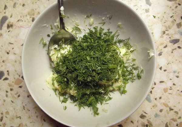 Step 4. Prepare the filling. Mix softened butter with garlic and herbs. Use a garlic press to prepare garlic.