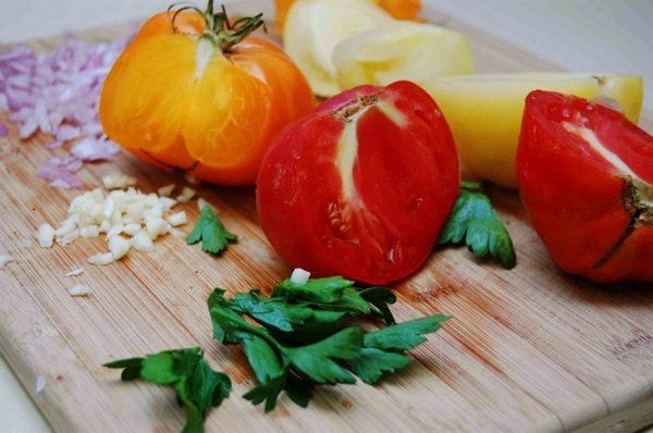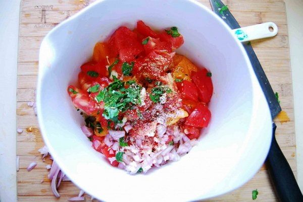 1. Cut onions, garlic and greens very small, for a start. Cut tomatoes, too.