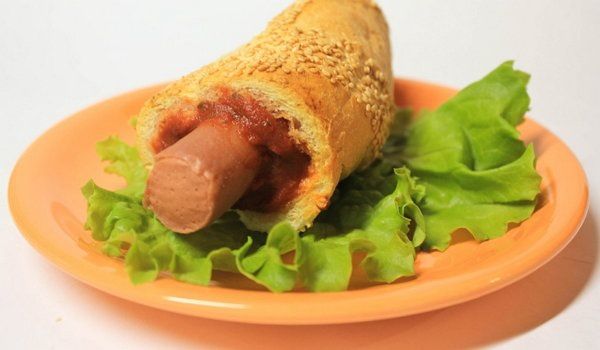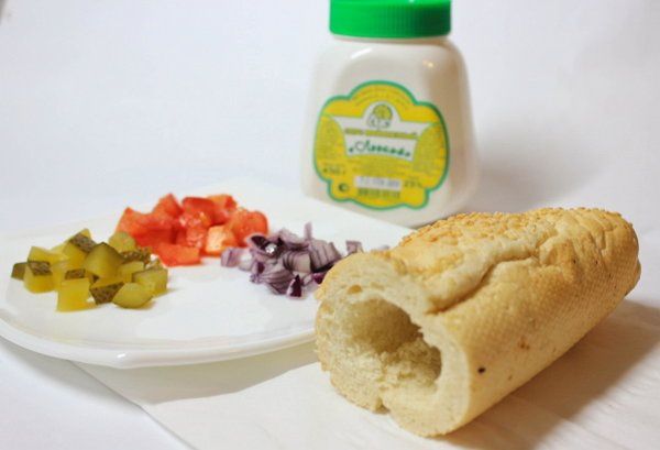 4. Now put into the hole mayonnaise, mustard, vegetables and a sausage. Apply ketchup around the edges.