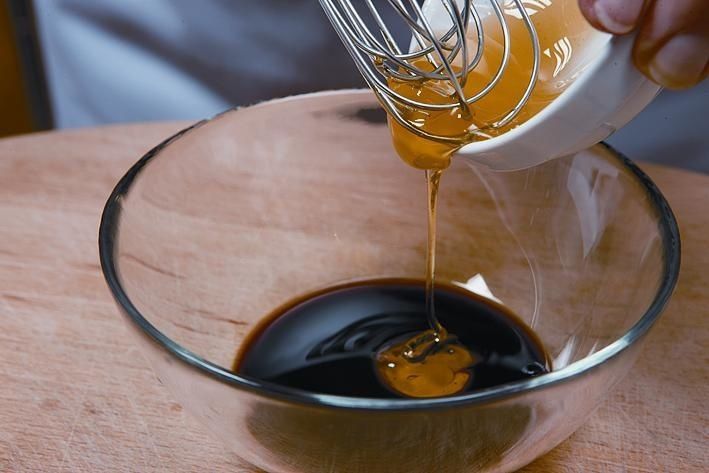 Put the leeks on a dish and sauce it with the sauce. You also sauce it with the mixture mad out of balsamic vinegar and honey. Put everything in the refrigerator. The leeks should soak with the sauce.