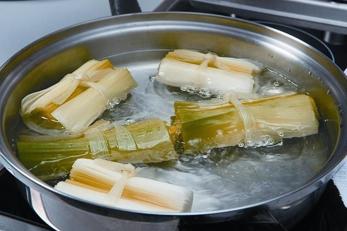 Boil water in a big stewpot, add salt. Put leeks inside it, bring it to a boil and boil leeks for 15-20 minutes. Cool down the ready leeks in the refrigerator. Then, take a napkin and wipe the leeks with it thoroughly. Put leeks on a dish.