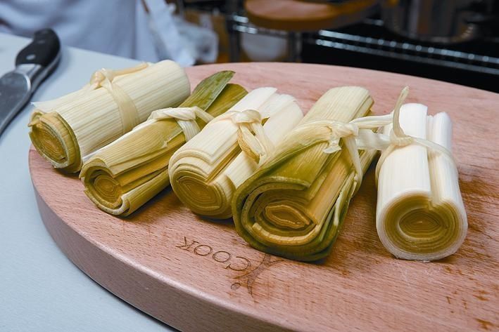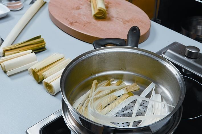 Slit leeks. The length of pieces should be 10 cm. Then, wash them thoroughly and connect them using a kitchen string. This way leeks won’t lose its form.