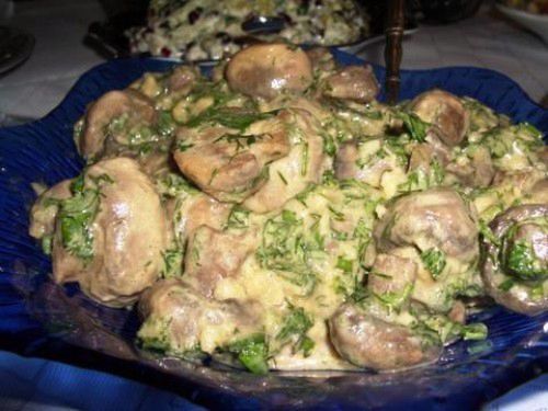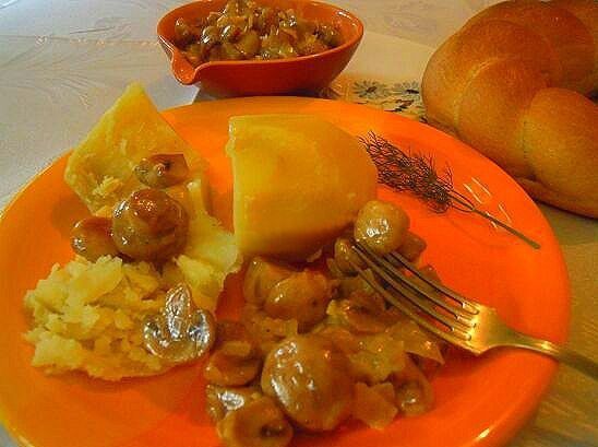You can cook the oyster mushrooms the same way. Instead of stewing the mushrooms on the gas-stove you can stew them in the baking oven or furnace at the temperature of 170-180 C for 20-25 minutes. Pick some fresh, not large champignons for the cooking and sour cream that is not too thick. To make them taste more distinctly, fry the champignons with oil until they are golden brown and the water is off. Mashed potatoes or buckwheat groats will do nicely.