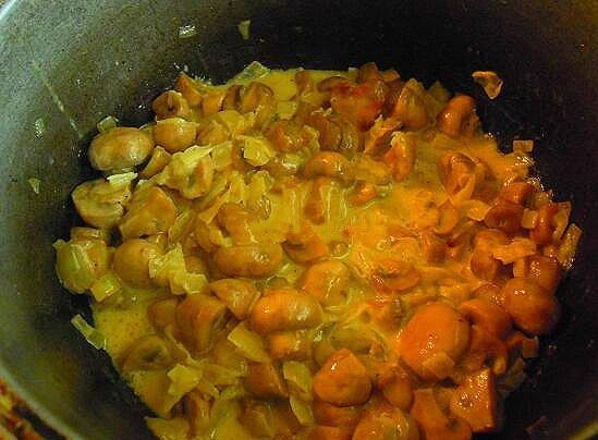 The mushrooms are done. Add the chopped onion. Keep frying the mushrooms with the onion over medium heat until it turns golden. Salt and pepper to taste. Add some sour cream.