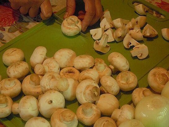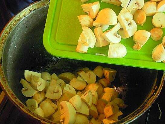 Peel the champignons and wash them under the running water. Cut large and medium mushrooms in 4 pieces, but don’t cut the small ones.