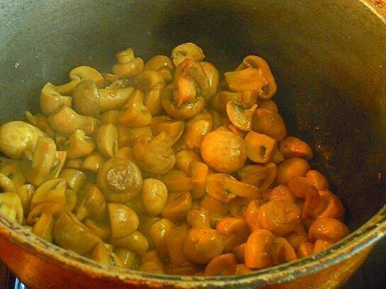 Heat the vegetable oil in a large cooking pot. Put the mushrooms into it.