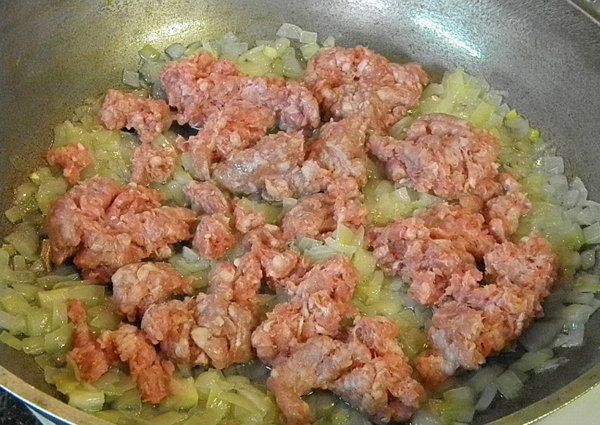 4. Add mince to the onion. Break coarse pieces with the spoon, stir periodically and fry to readiness of the mince. Add salt and oregano to your taste.