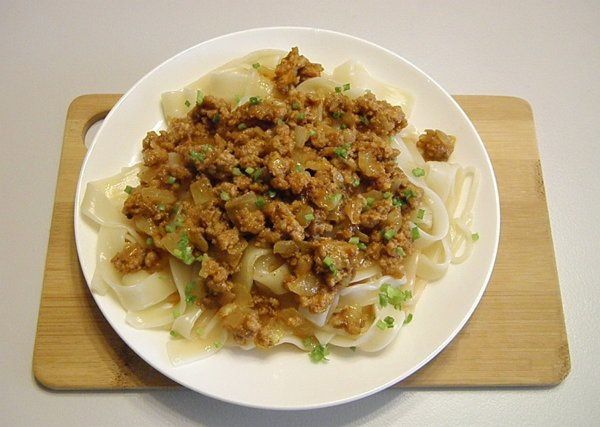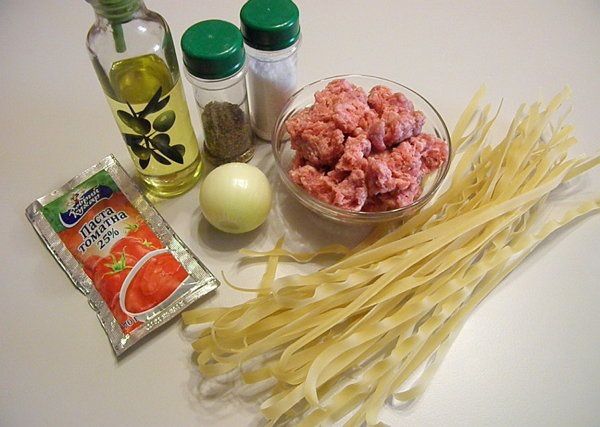 As a first step, one needs to fry mince with onion, add tomato paste and smother to readiness. Serve the pasta a la carte with mince and tomato. Good luck!