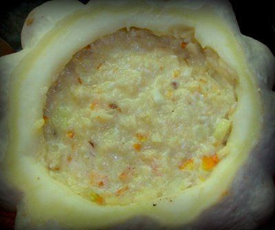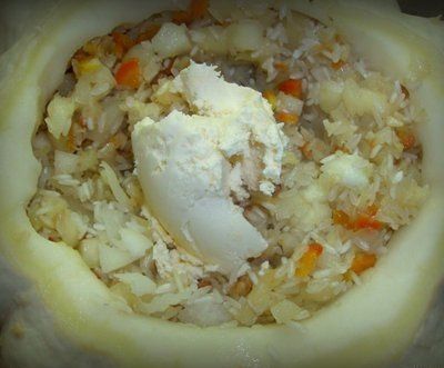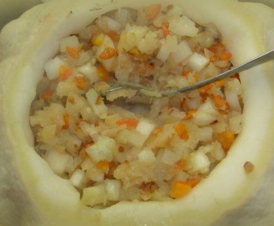 13. We fill empty space of a marrow with the cooked mix. Before stacking a stuffing, we rub inside walls of marrow with salt.