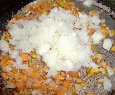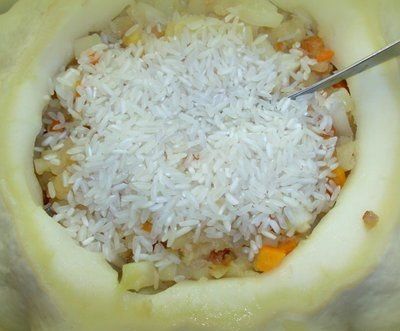 14. We add rice. Rice will connect the liquid which appears in process of cooking and will give satiation to a dish. We add rice by eye, first of all estimating how much space is left in a star-shaped marrow.