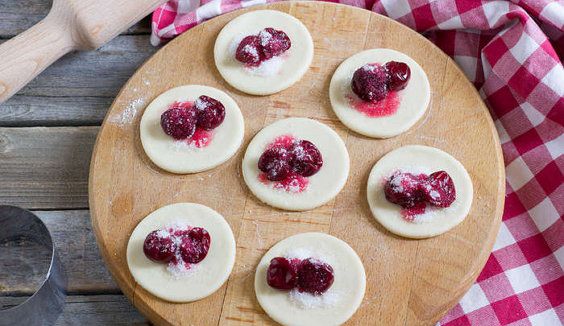Place 2-3 cherries and some sugar into the center of each circle.