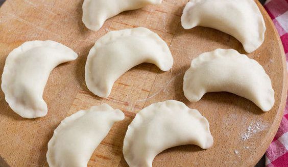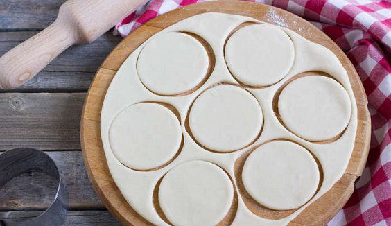 Roll out your elastic dough on the table slightly powdered with flour into the layer of 2 mm in thickness. Take a glass or any round-shaped mold and cut the circles of 6 cm in diameter.
