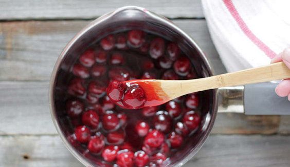 Make a sauce: mix the cherries, the starch and some sugar in the stewpan, bring it to the boil and cook for 5-7 min on the slow fire.
