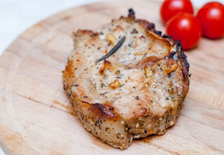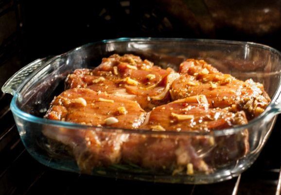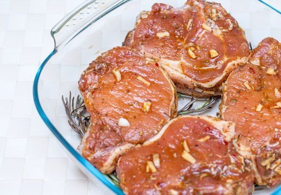 1. The pieces of loin, we dry them using napkins and paper towels, and then we put into the cup, where we will marinate.