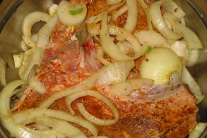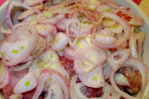 3. Leave onions with marinade for about half an hour then mix it with meat and leave for forty minutes more.
