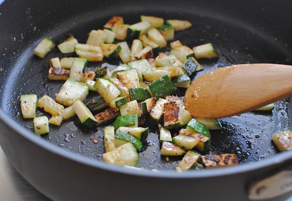 At the beginning we warm a little vegetable oil in a frying pan and we put in it cut in cubes marrow. We fry zucchini to a golden crust, and then we put it to a plate.