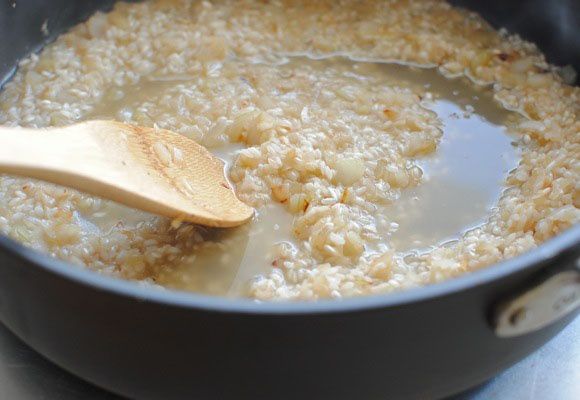 After a while we pour in wine in a frying pan, rice quickly enough absorb it. Further you should add 0,5-1 glass of broth and continue to cook rice on slow fire, adding in process of liquid absorption half of glass of broth.