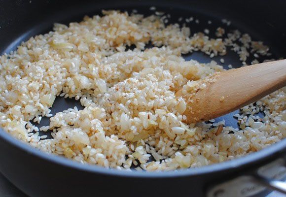 Then we grind onions, add a little more oil in a frying pan and fry onions till golden color. After that we pour out rice in a frying pan, fry it with onions, slowly stirring, for 1-2 minutes.